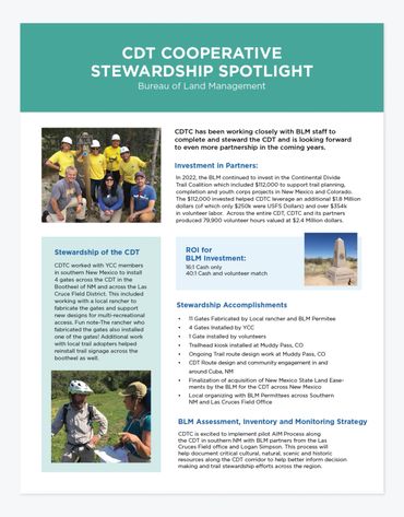The Continental Divide Trail Coalition (CDTC) serves as the primary nonprofit partner, leading volunteer recruitment, trail maintenance, protection, and advocacy efforts.
